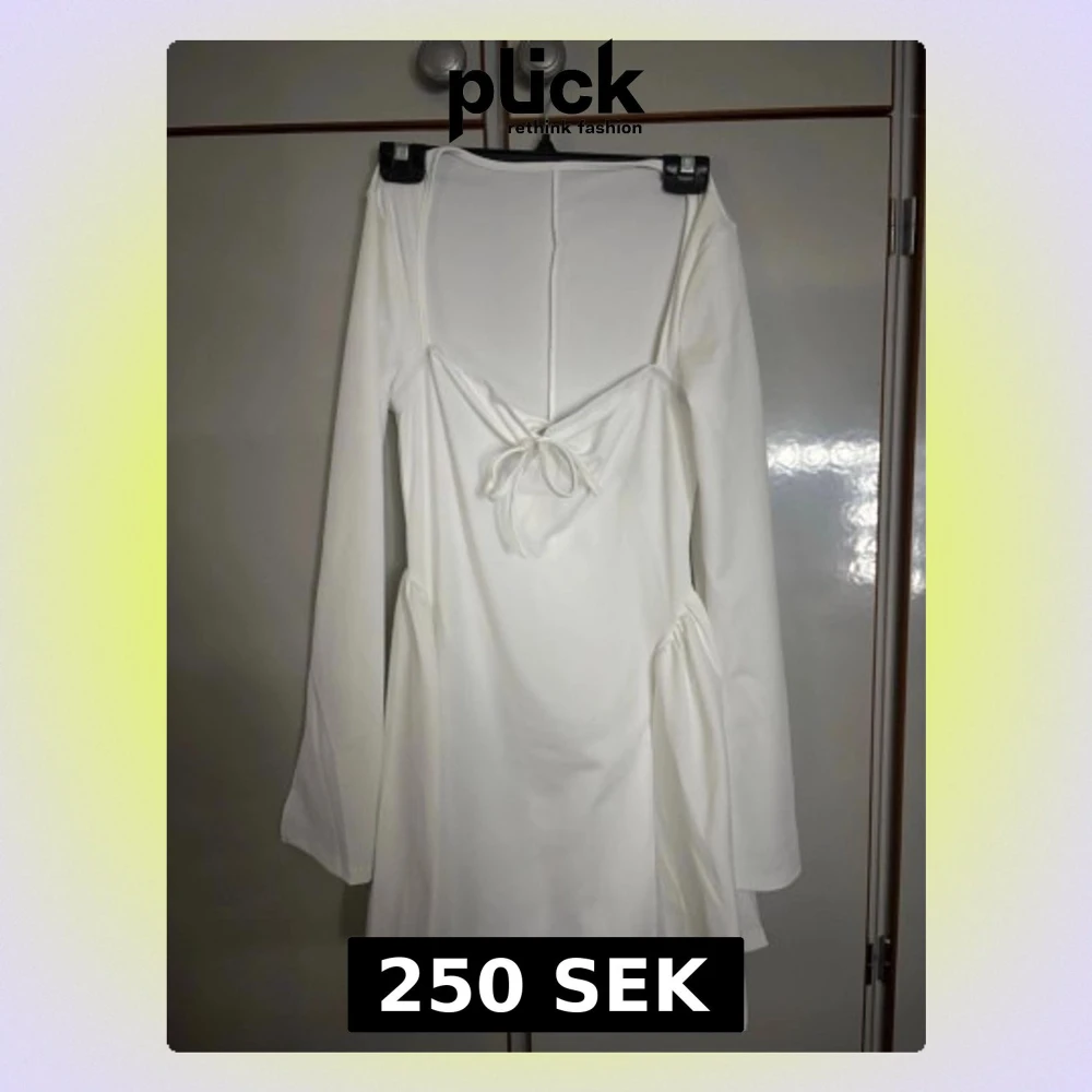 Säljer en stilren vit kortklänning med lång ärm och v-ringning framtill. Klänningen har en snygg knyt-detalj vid bysten och lätt utsvängda ärmar. Perfekt för dig som gillar minimalistisk och trendig stil.