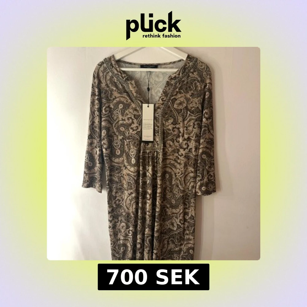 Elegant klänning från Ilse Jacobsen i ett vackert paisley-mönster. Klänningen har en V-ringning med dekorativa detaljer. Perfekt för både vardag och fest. Storlek M. Nypris 1800kr. Ny med prislapp