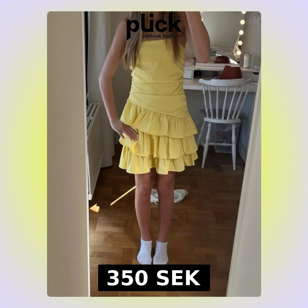 Söt gul axelbandslös klänning med flera lager volanger och figurnära passform. Perfekt för sommarens alla tillfällen. Klänningen är kort och har en fräsch, ljus färg som verkligen poppar. Tillverkad i ett lätt och luftigt material.