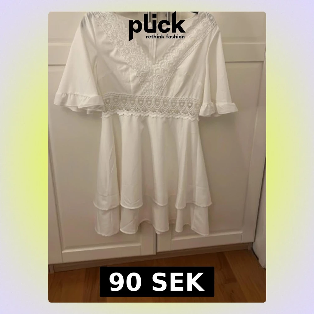 Söt vit kortklänning med v-ringning och vackra spetsdetaljer längs halsringningen och midjan. Klänningen har volang vid ärmslut och kjol, samt korta ärmar. Perfekt för sommarens alla tillfällen.
