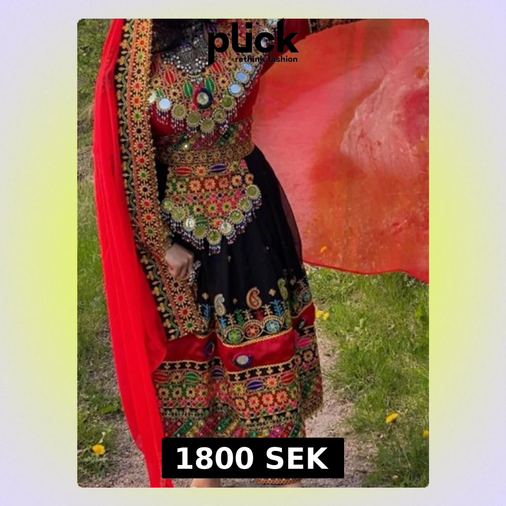 Unik klänning med färgstarka broderier i rött, svart, grönt och gult. Klänningen har kort längd, långärmad topp och är dekorerad med speglar, pärlor och detaljerade mönster. Materialet känns som bomull och polyester. Perfekt för dig som vill sticka ut med traditionell stil.