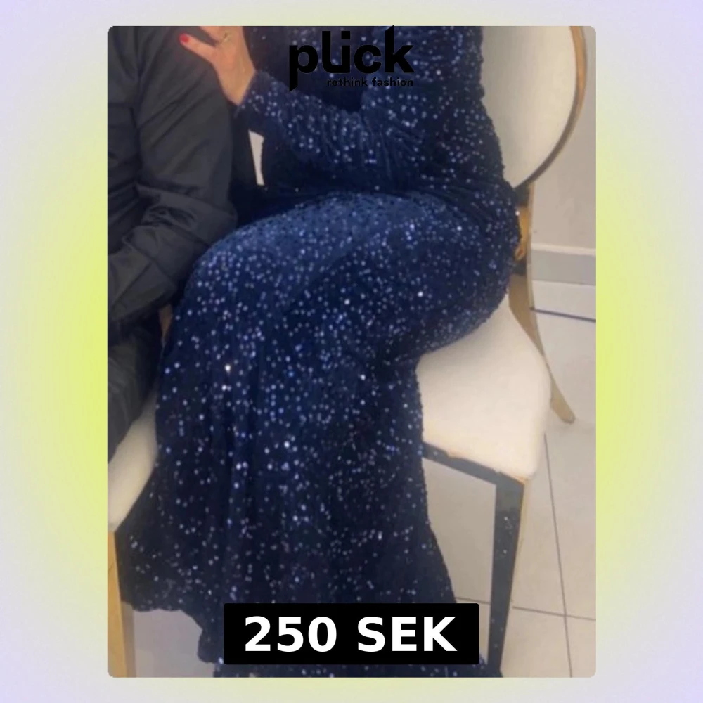 Säljer en marinblå långklänning täckt av glittriga paljetter. Klänningen har lång ärm och figurnära passform som ger en elegant siluett. Perfekt för dig som vill sticka ut på bal eller fest. Materialet känns lyxigt och skimrar snyggt i ljuset.