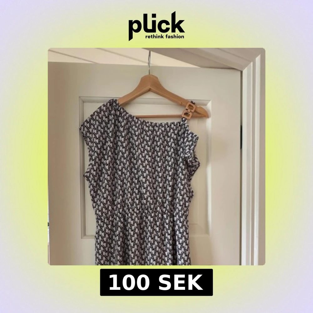 Snygg svartvit klänning med grafiskt mönster och en cool detalj med spänne på ena axeln. Klänningen har en avslappnad passform och är ärmlös, perfekt för varma dagar. Materialet känns lätt och luftigt.