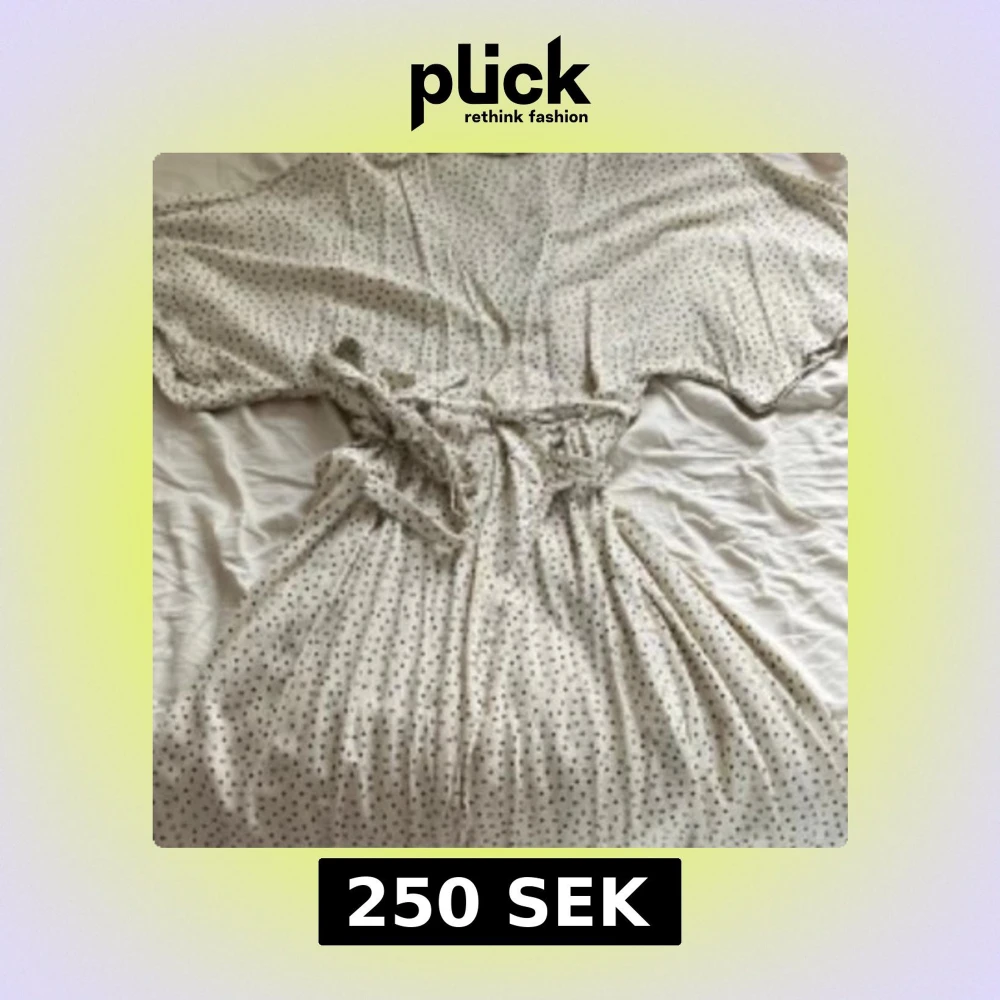 Superfin ljus omlottklänning med små svarta prickar och knytband i midjan. Klänningen har korta, vida ärmar och v-ringning. Perfekt för varma dagar och ger en avslappnad men ändå söt look.