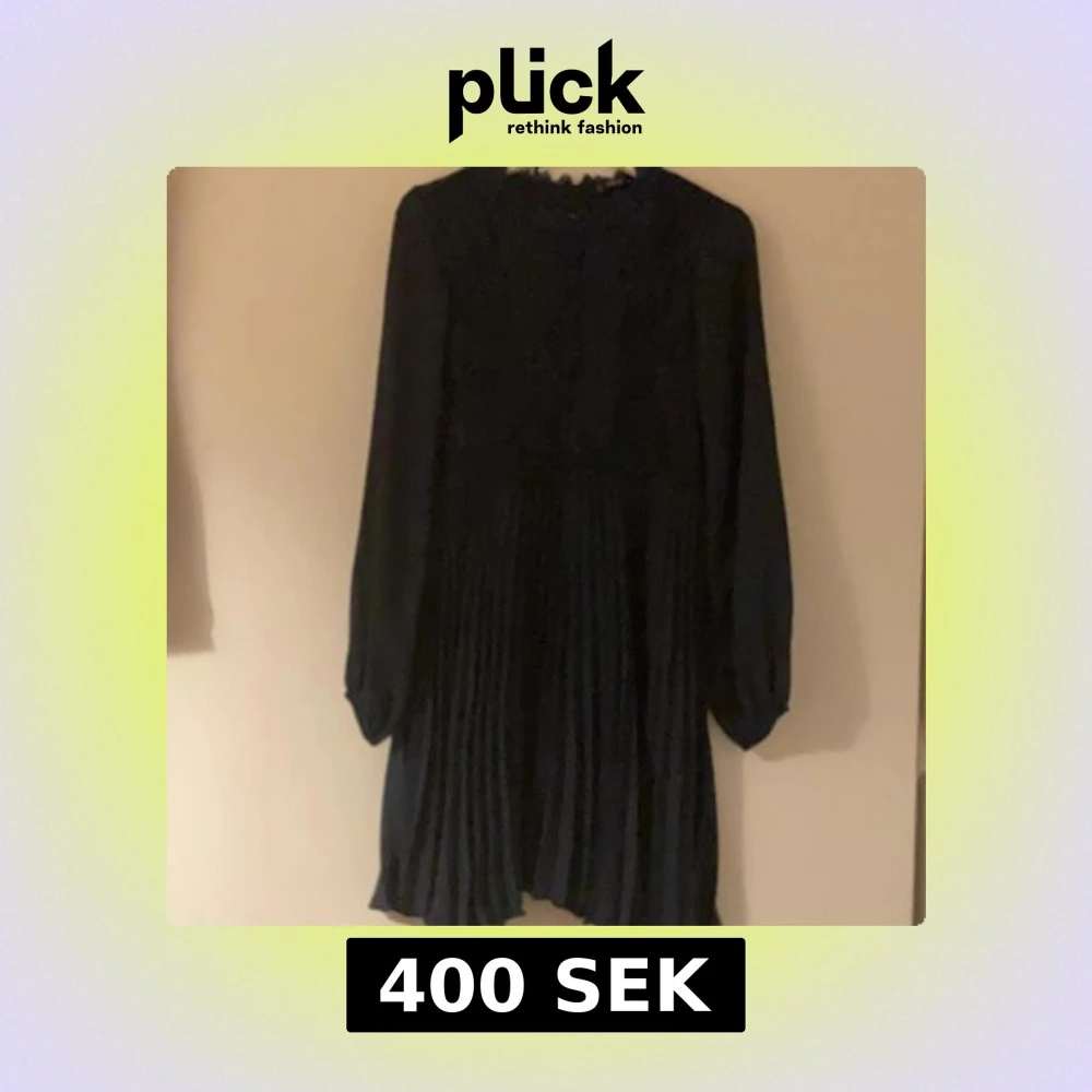 Supersnygg mörkblå kortklänning med plisserad kjol och långärmade ärmar. Överdelen har fina spetsdetaljer och hög hals. Perfekt för dig som gillar en stilren look med extra detaljer. Kjolen är luftig och ger en cool rörelse. Oanvänd