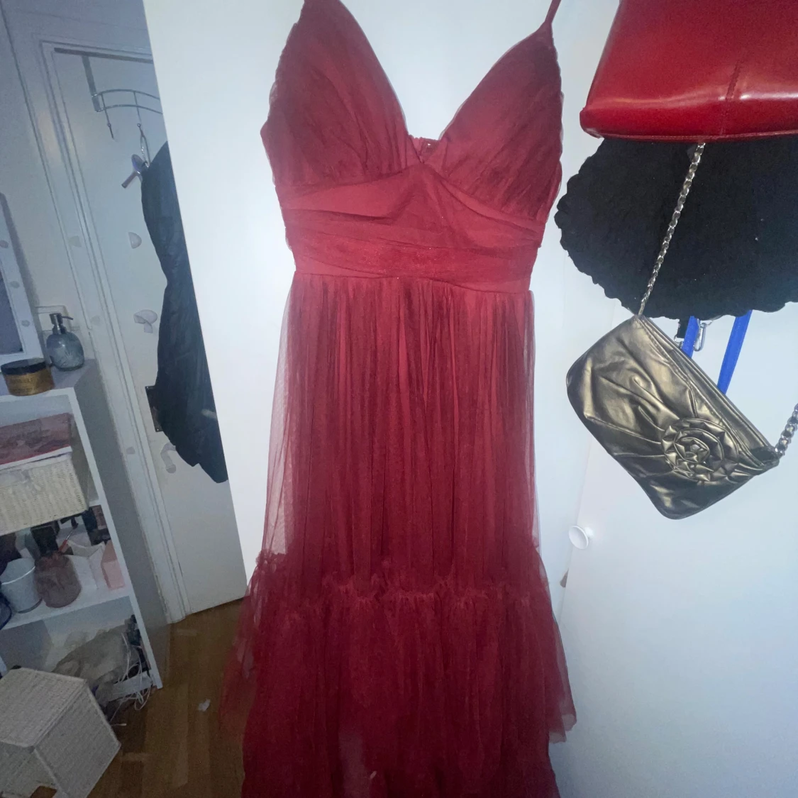 Säljer en vinröd långklänning med djup v-ringning och tunna axelband. Klänningen har flera lager tyll som ger en fluffig och romantisk känsla. Baktill finns en dragkedja för enkel påklädning. Perfekt för dig som vill sticka ut med en elegant look.