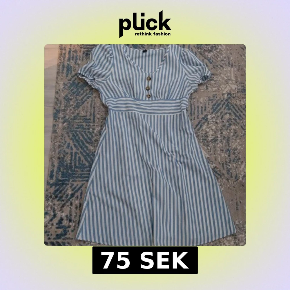 Säljer en söt blåvit randig kortklänning med v-ringning och tre dekorativa knappar framtill. Klänningen har puffiga korta ärmar och ett markerat midjeparti som ger en fin siluett. Perfekt för dig som gillar fräscha och somriga vibes!