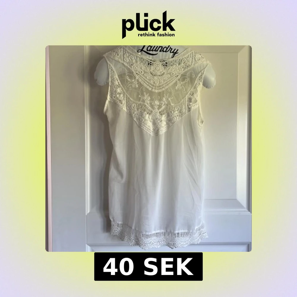 Säljer en söt vit ärmlös klänning med vackra spetsdetaljer upptill och nertill. Klänningen har en romantisk känsla med broderad spets över axlar och rygg samt längs fållen. Perfekt för sommarens alla tillfällen!