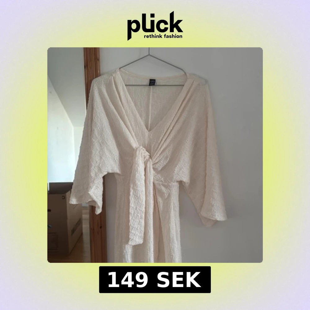 Lång ljusbeige omlottklänning från SHEIN med v-ringning och knyt framtill. Klänningen har vida trekvartsärmar och är gjord i ett strukturerat, lätt material som ger en luftig känsla. Perfekt för sommarens varma dagar.