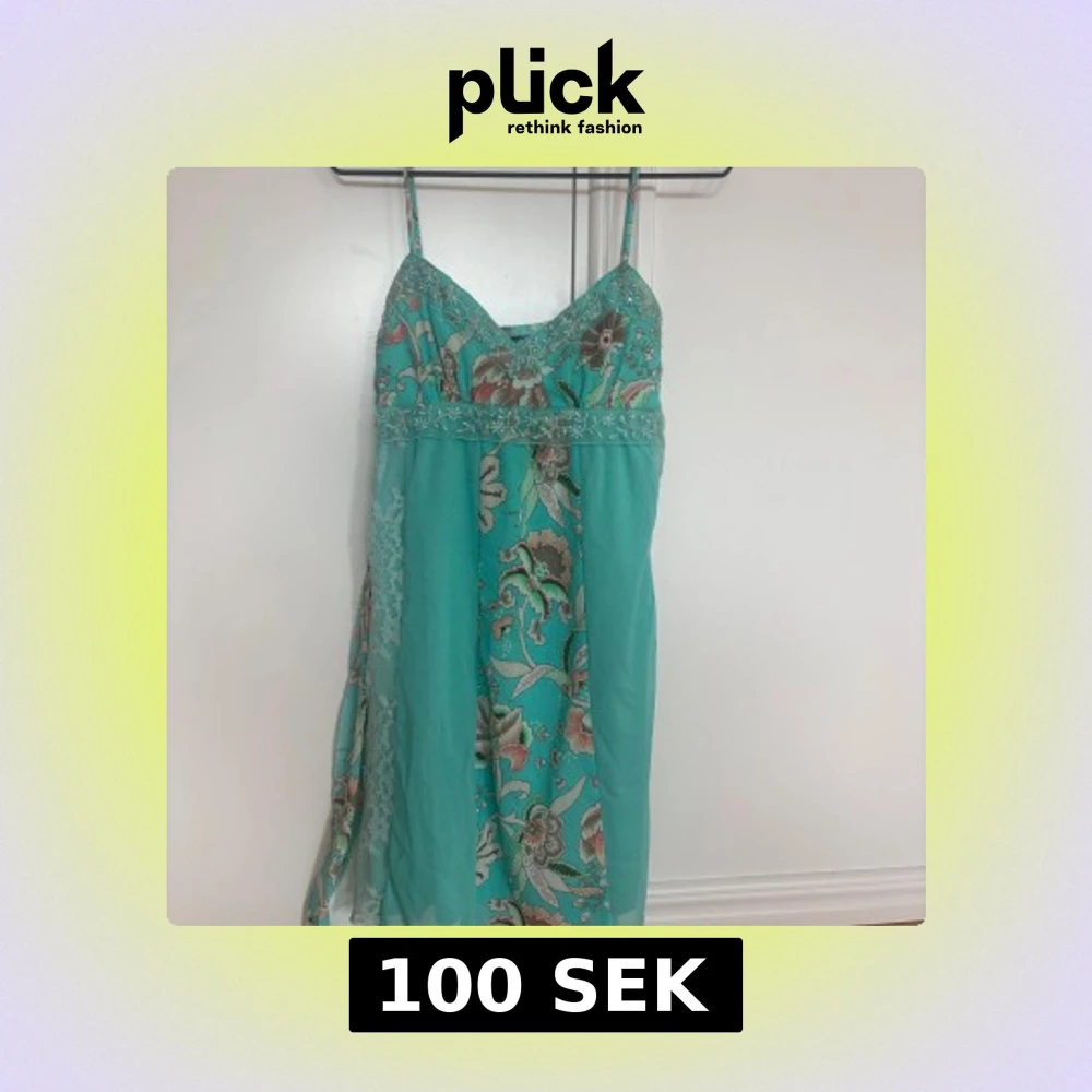 Superfin turkos kortklänning från Triangles med blommigt mönster, tunna axelband och spetsdetaljer. Klänningen har omlottkänsla.