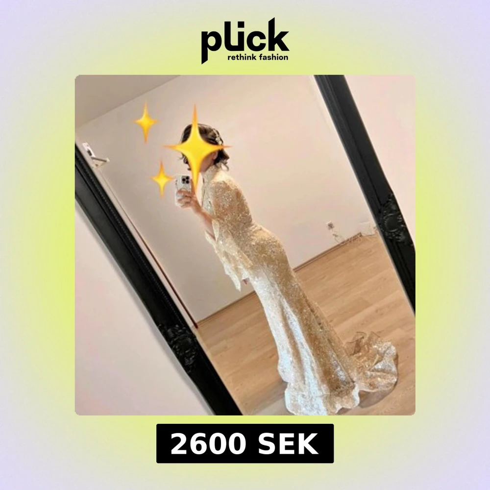 Superelegant långklänning i champagnefärg med glittriga paljetter över hela tyget. Klänningen har lång ärm med utsvängda spetsdetaljer och en figurnära passform som framhäver siluetten. Perfekt för bal eller fest där du vill glänsa extra mycket. Storlek 38