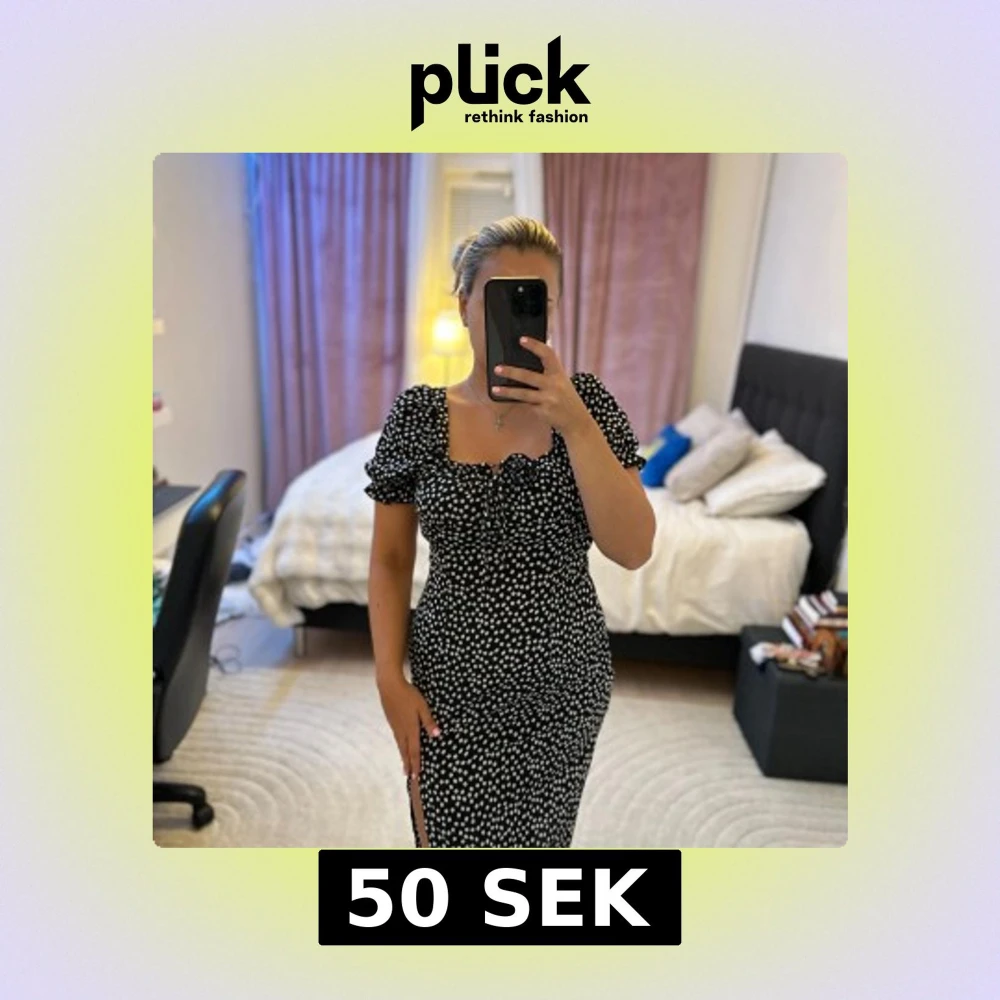 Supersöt svart midiklänning från SHEIN med vita små blommor, puffiga korta ärmar och söt knytning vid bysten. Klänningen har en smickrande slits på sidan och figurnära passform. Perfekt för dig som gillar trendiga och feminina detaljer!