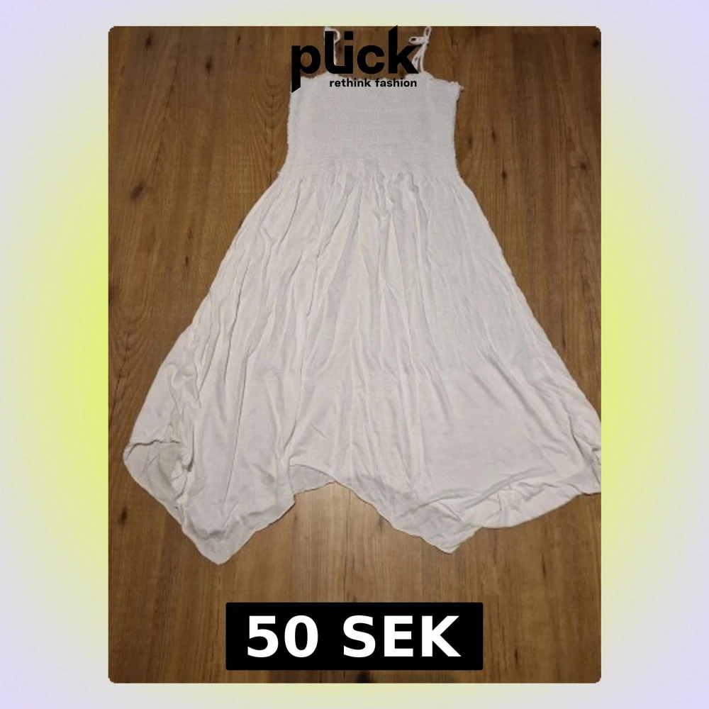 Luftig vit klänning. Klänningen har smock upptill, axelband och ett fladdrigt fall. Perfekt för varma dagar och enkel att styla med sneakers eller sandaler.