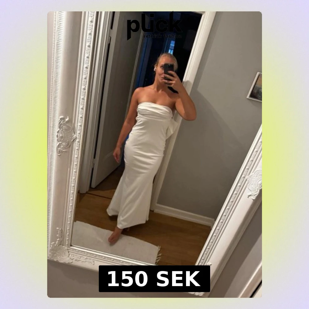 Säljer en elegant vit långklänning med axelbandslös design och draperad detalj över bröstet. Klänningen har en slank passform och faller snyggt längs kroppen. Perfekt för dig som vill ha en stilren och modern look.