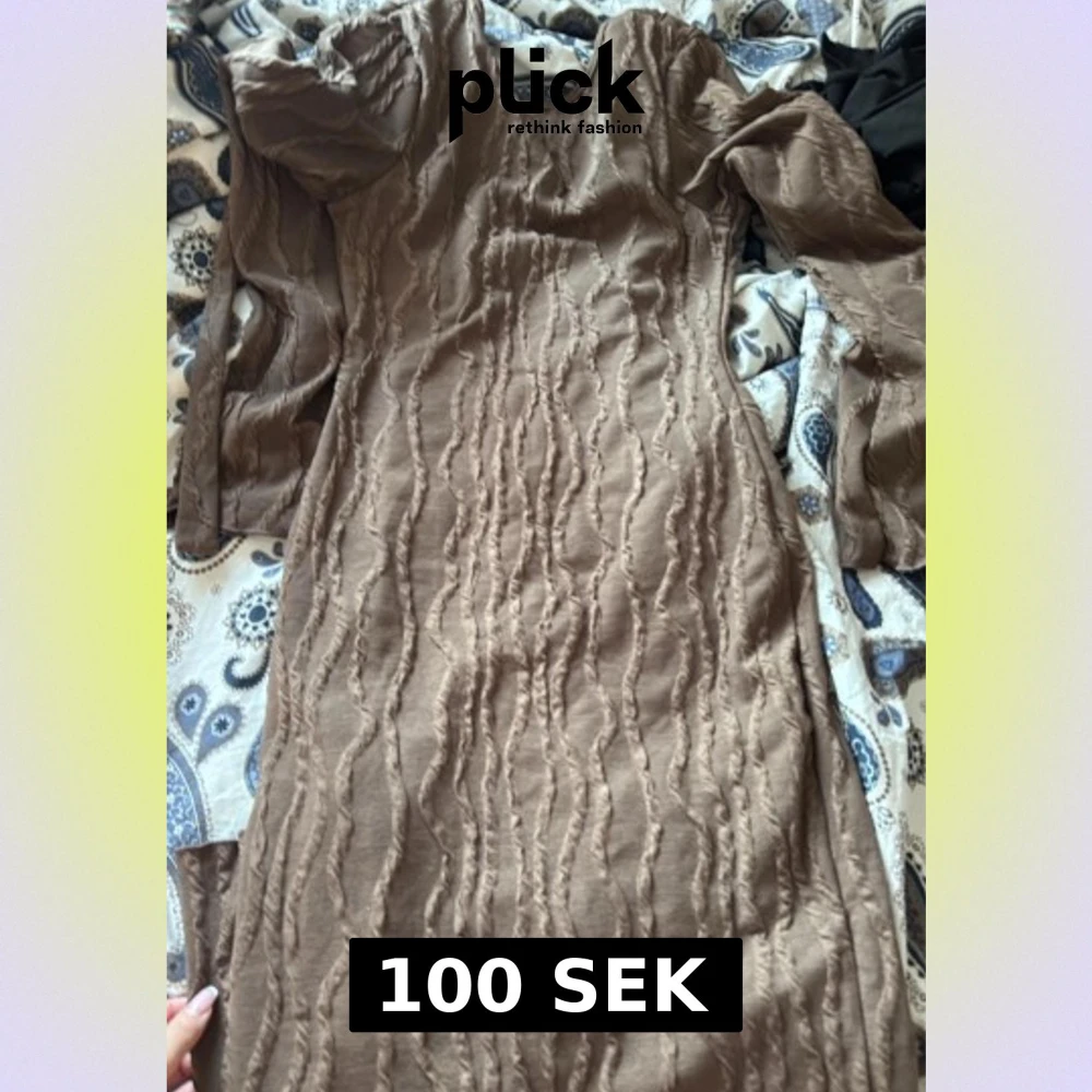 Säljer en brun långärmad omlottklänning med snygg struktur i tyget och med bälte i midjan. Klänningen har en unik vågig textur och är i mjukt material som känns skönt mot huden. Perfekt för dig som vill ha något annorlunda och trendigt.