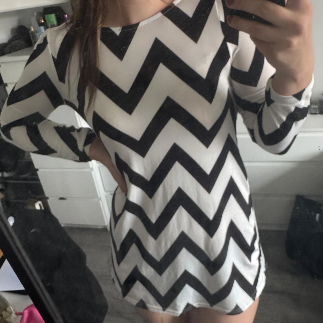 Snygg svartvit klänning med zigzag-mönster. Klänningen har långa ärmar. (Katt och kanin finns i hemmet)