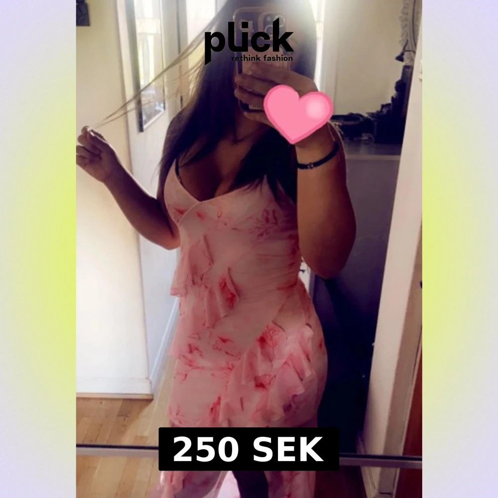 Supersöt rosa klänning med blommigt mönster och volangdetaljer. Omlottmodell med v-ringning och slits framtill. Perfekt för sommarens alla tillfällen och ger en romantisk vibe.