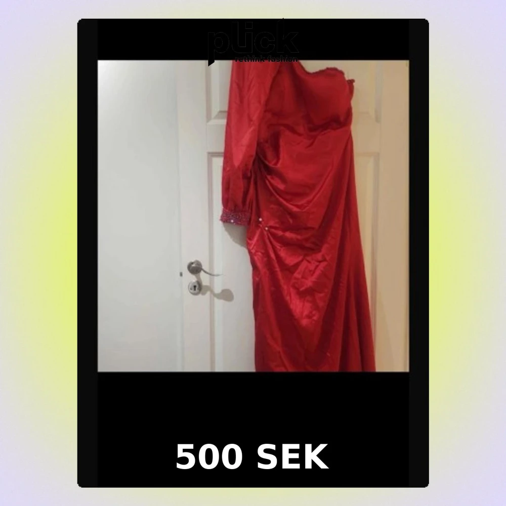 Snygg röd långklänning med en axel och lång ärm. Klänningen har pärldetaljer vid ärmslutet och draperad effekt längs sidan. Perfekt för dig som vill sticka ut på bal eller fest. Materialet har en glansig finish.