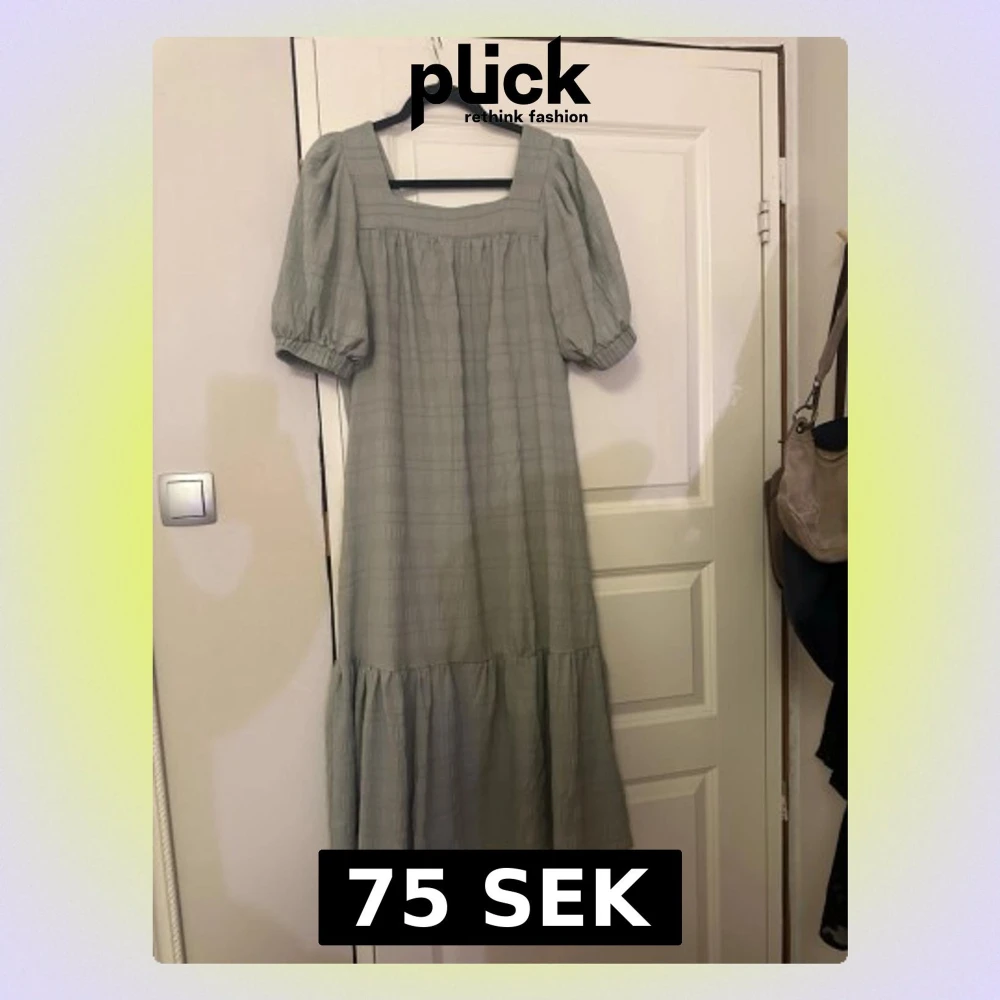 Säljer en ljusgrå långklänning med puffärmar och fyrkantig ringning. Klänningen har ett subtilt rutmönster och är tillverkad i ett mjukt bomullstyg. Den har volang nedtill och en avslappnad passform som ger en skön och trendig look.