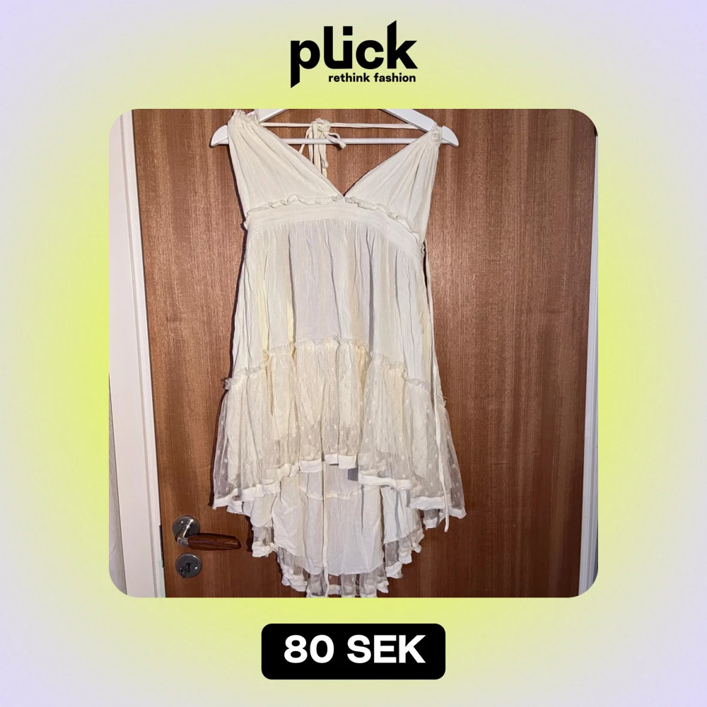 Säljer en superfin vit klänning perfekt för sommaren! Den har en v-ringad design med volanger och knytband i ryggen. Materialet är lätt och luftigt, vilket gör den idealisk för varma dagar. Klänningen har en romantisk känsla med sina spetsdetaljer och ärmlösa stil. Passar perfekt till både strand och fest!