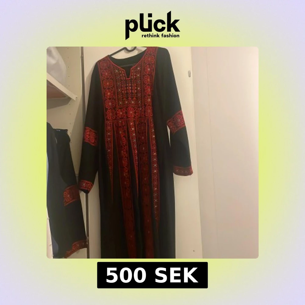 Unik svart långklänning med fantastiska röda broderier och detaljer i geometriska mönster. Klänningen har långa ärmar och v-ringad hals. Broderierna har inslag av små färgdetaljer i blått och vitt. Perfekt för dig som vill sticka ut med en traditionell och färgstark look. Har en annan likadan i storlek S