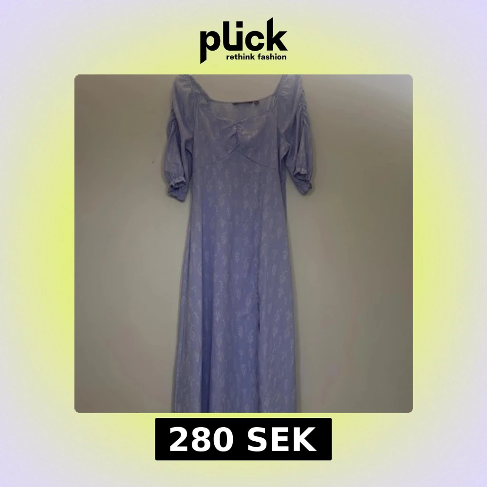 Superfin ljuslila långklänning med vitt blommigt mönster. Klänningen har puffiga trekvartsärmar, v-ringning och en slits framtill. Perfekt för sommarens alla tillfällen! Materialet känns lätt och luftigt.