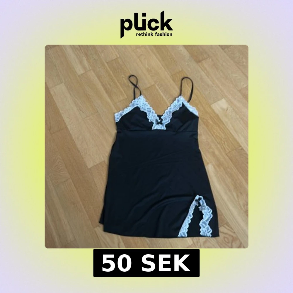 Svart kort klänning/nattlinne med tunna axelband och vit spets längs v-ringningen och slitsen. Märke är oklart men säljer för 50kr