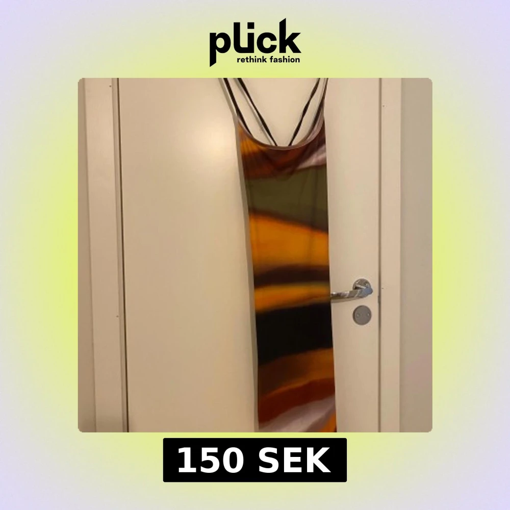 Säljer en långklänning med smala axelband och öppen rygg. Klänningen har ett färgstarkt mönster i orange, grön, svart och brunt med inslag av vitt. Materialet känns lätt och stretchigt, perfekt för varma dagar. Snygg passform med smickrande siluett.