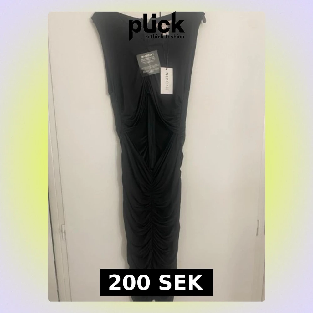 Snygg svart midiklänning från NLY One med draperad design och cut out-detalj framtill. Klänningen har figurnära passform, rund halsringning och är ärmlös. Materialet är stretchigt och följsamt, perfekt för en trendig look.Aldirg använd