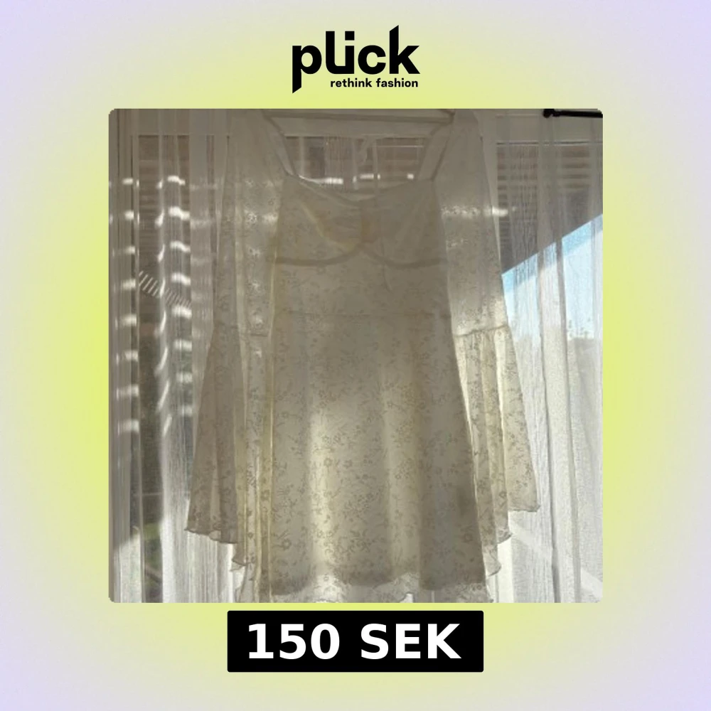 Superfin vit kortklänning med diskret blommigt mönster och trumpetärmar. Klänningen har fyrkantig urringning och knyt i ryggen, vilket ger en romantisk vibe. Lätt och luftig, perfekt för varma dagar. Materialet känns som tunn bomull eller polyester.