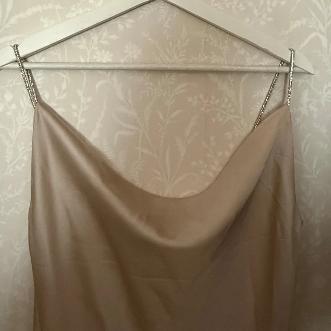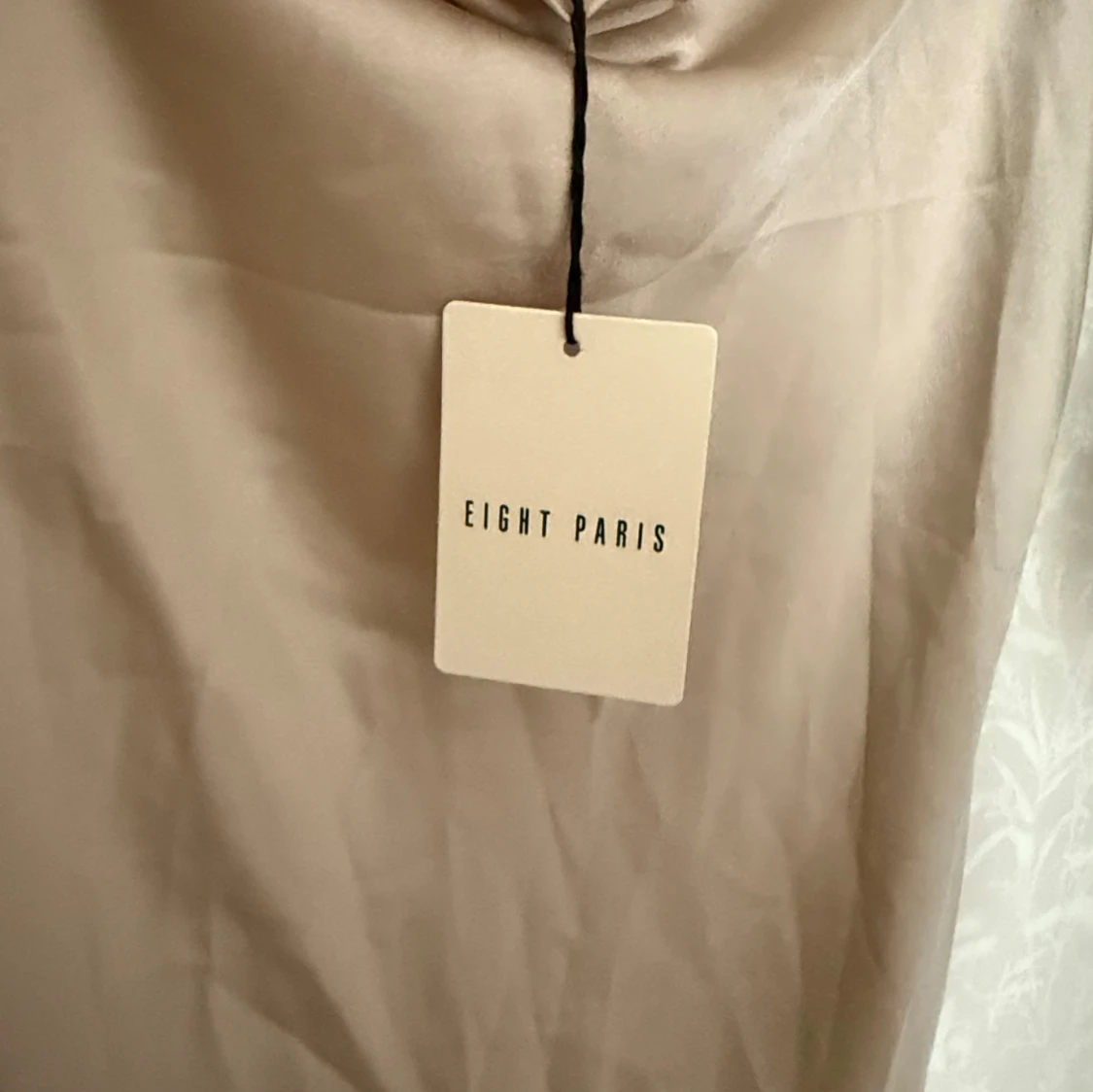 Elegant beige klänning från Eight Paris med tunna axelband och en mjuk, draperad halsringning. Perfekt för en stilren look. Ny med prislapp på