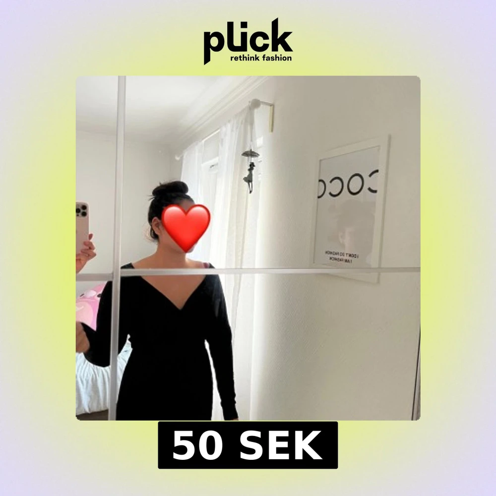 Säljer en svart kort omlottklänning med lång ärm och djup v-ringning. Klänningen har en figurnära passform och markerad midja, vilket ger en snygg siluett. Perfekt för dig som gillar stilrena och trendiga plagg.