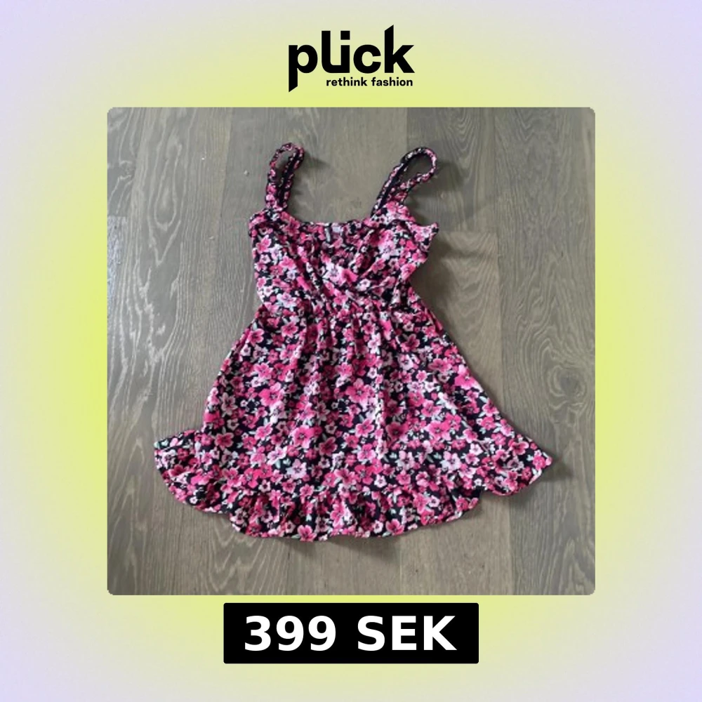 Supersöt omlott kortklänning med volangkant och smockade axelband från H&M. Klänningen har ett färgstarkt blommönster i rosa, vitt och svart. Perfekt för varma dagar med sin lätta och luftiga känsla.
