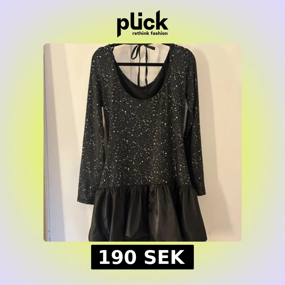 Snygg svart klänning med glittrigt mönster och volangdetalj. Den har långa ärmar och en rund halsringning med knytband i nacken. Perfekt för en kväll ute eller en festlig tillställning.