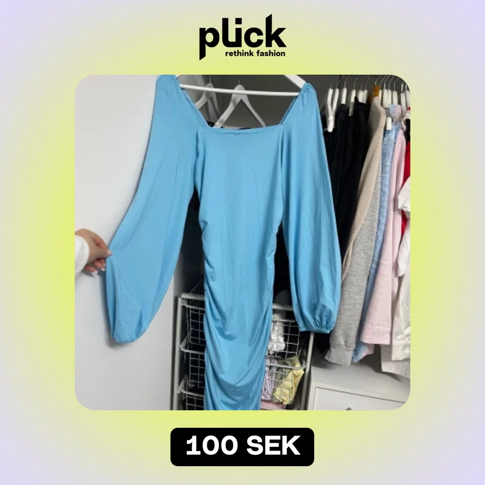Säljer en superfin ljusblå klänning från Shein. Den har långa ärmar och en snygg rynkad detalj längs sidan som ger en cool effekt. Även på baksidan finns en rynkad detalj längst ryggen. Klänningen är perfekt för fest och materialet känns mjukt.