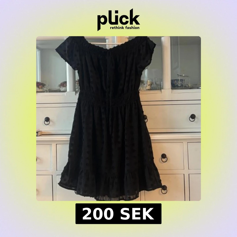 Svart klänning från Charlotte Russe i New York med prickigt mönster och offshoulder-design. Klänningen har volangdetaljer vid fållen och en elastisk midja för en bekväm passform. Perfekt för en stilren look.