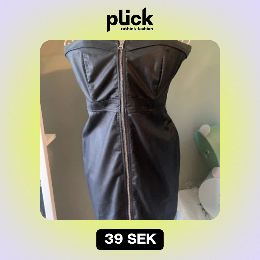 Kort axelbandslös svart klänning med dragkedja fram. Använt men fint skick. Resår i ryggen vilket ger fin passform.