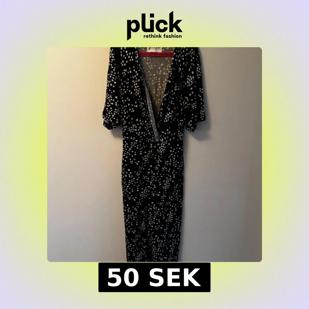 Svart klänning från Pure Female med vita prickar, en knut framtill, v-ringad och med korta ärmar. Klänningen har en slits framtill och är i mjukt, stretchigt material. Katt finns i hemmet, kontakta vid fler frågor🌷strl S/M?