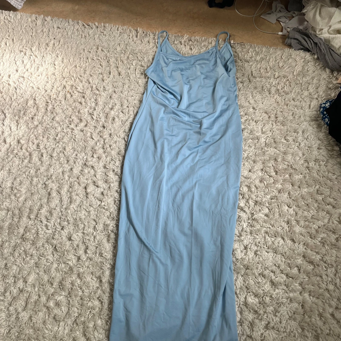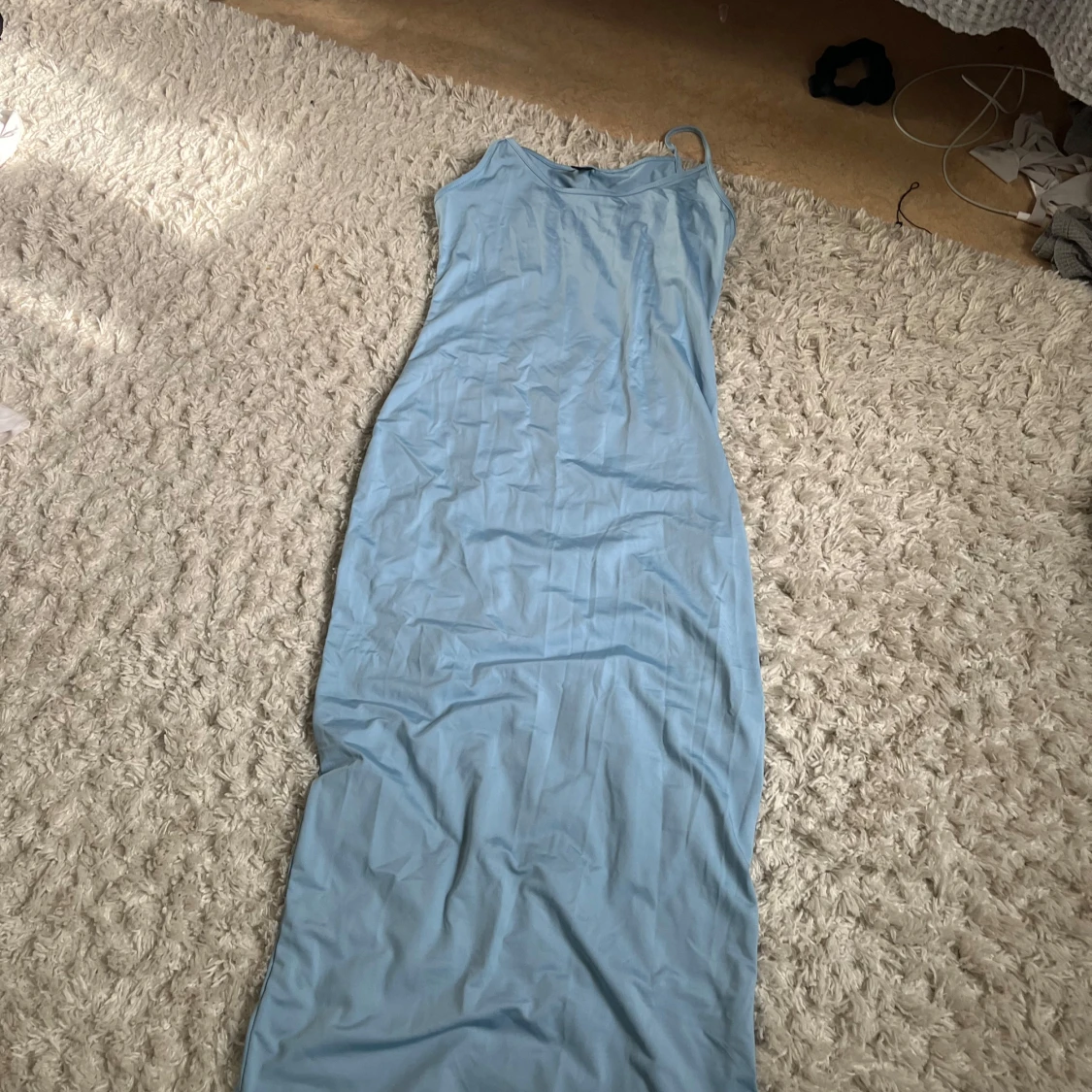 Säljer en ljusblå långklänning med smala axelband och rak passform. Klänningen har en enkel och stilren design, perfekt för dig som gillar minimalistiska vibes. Materialet känns mjukt och svalt, vilket gör den skön att bära under varmare dagar.