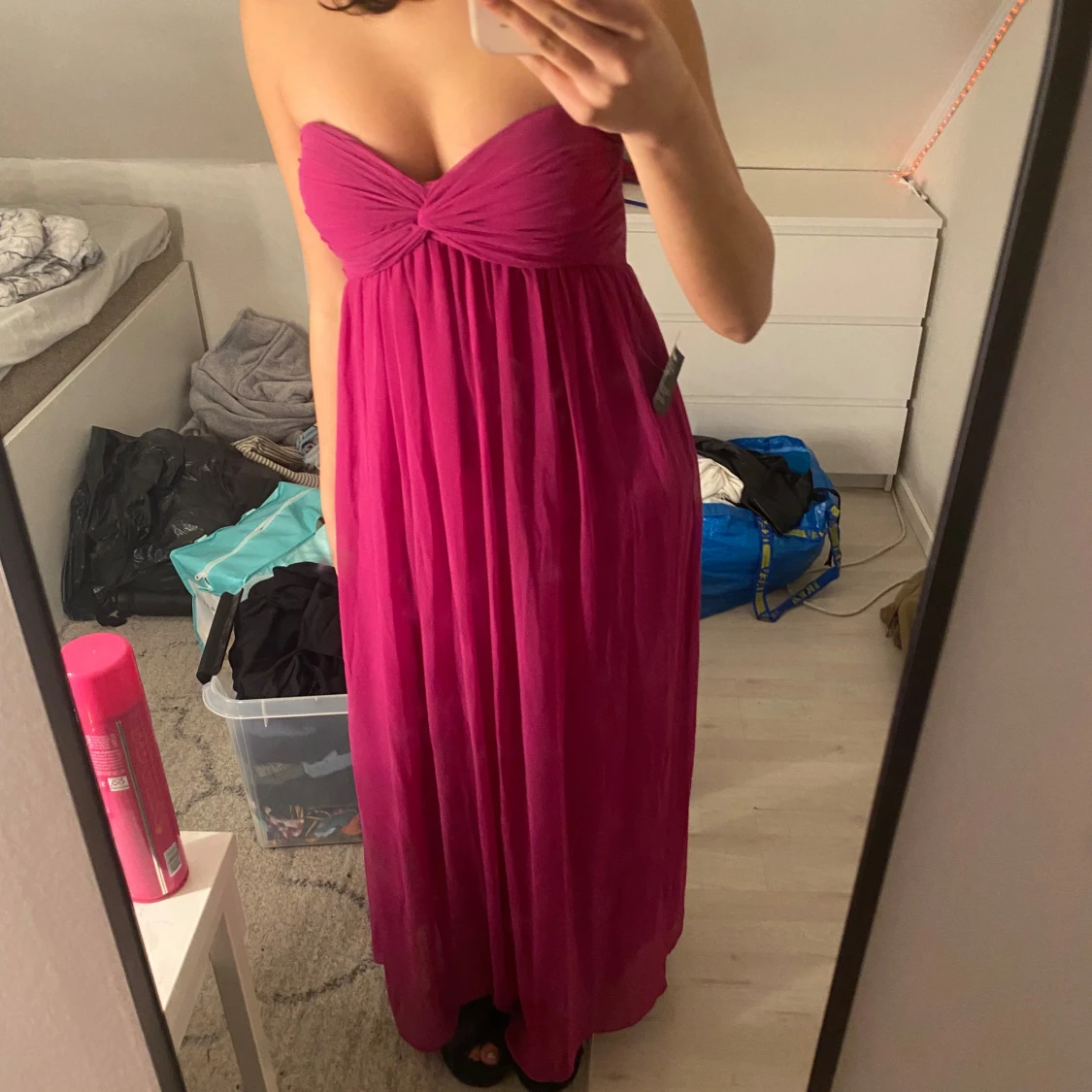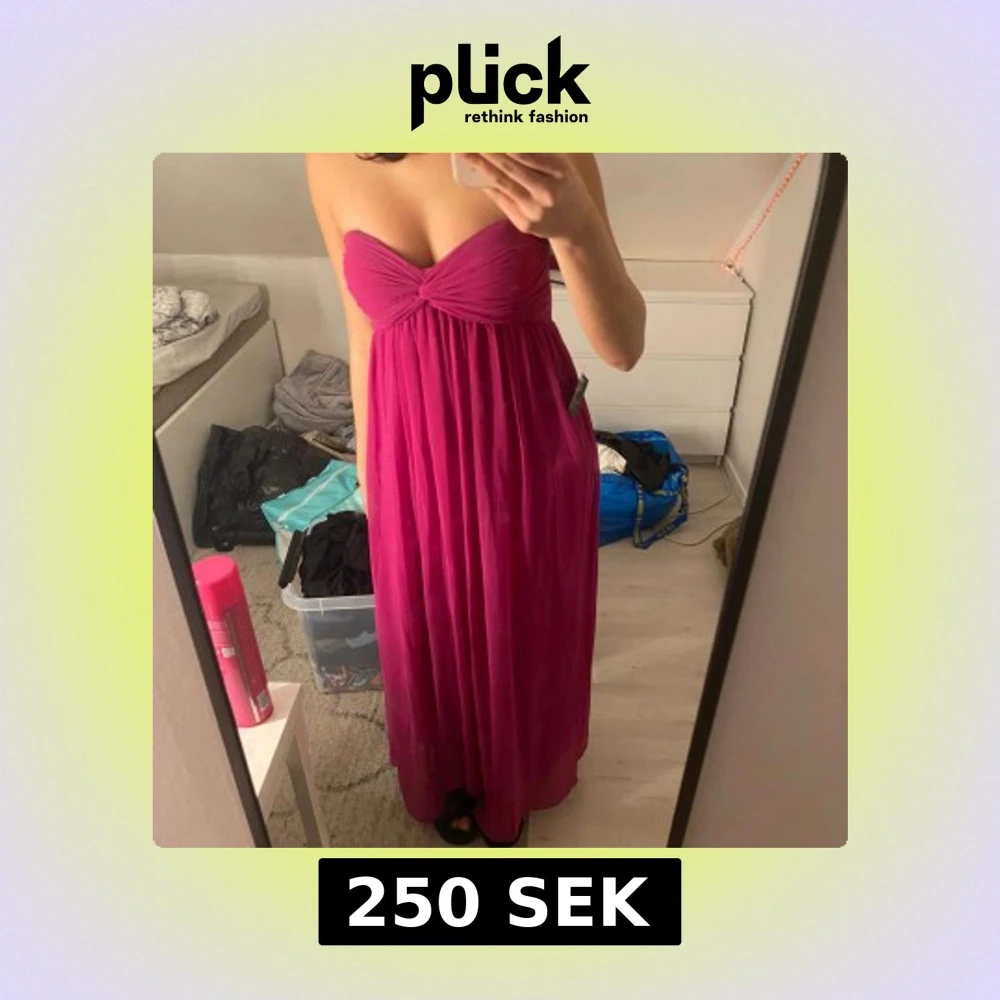 Säljer en snygg rosa axelbandslös långklänning med en knutdetalj framtill. Perfekt för sommarens festligheter eller en elegant kväll. Klänningen har en flytande passform som ger en vacker siluett.