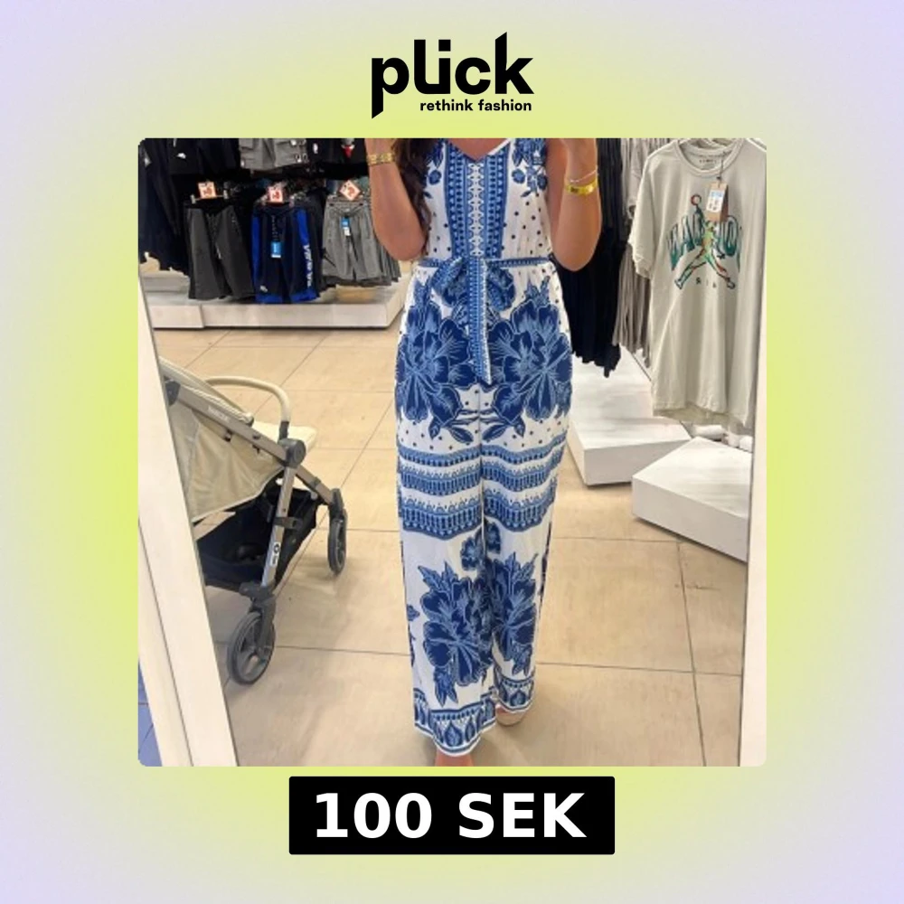Snygg byxdress i vitt med stora blå blommor och mönster. Vida ben och knytband i midjan ger en avslappnad och trendig look. Perfekt för sommardagar och festivaler. Lätt och luftig, med breda axelband och v-ringning framtill.
