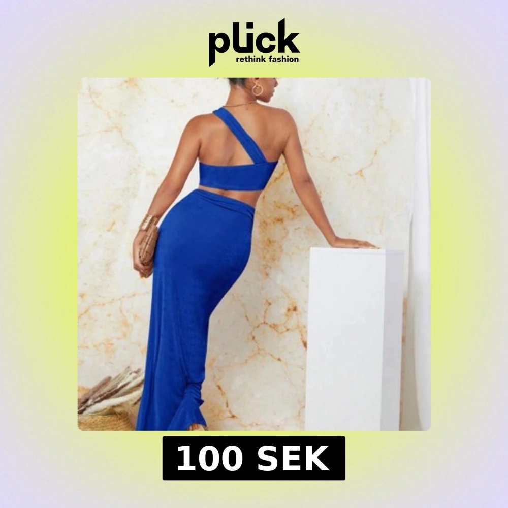 Säljer en kornblå set med asymmetrisk one shoulder och twistad detalj framtill. Setet har öppen midja, hög slits och figurnära passform. Perfekt för dig som vill sticka ut med en trendig och vågad look.