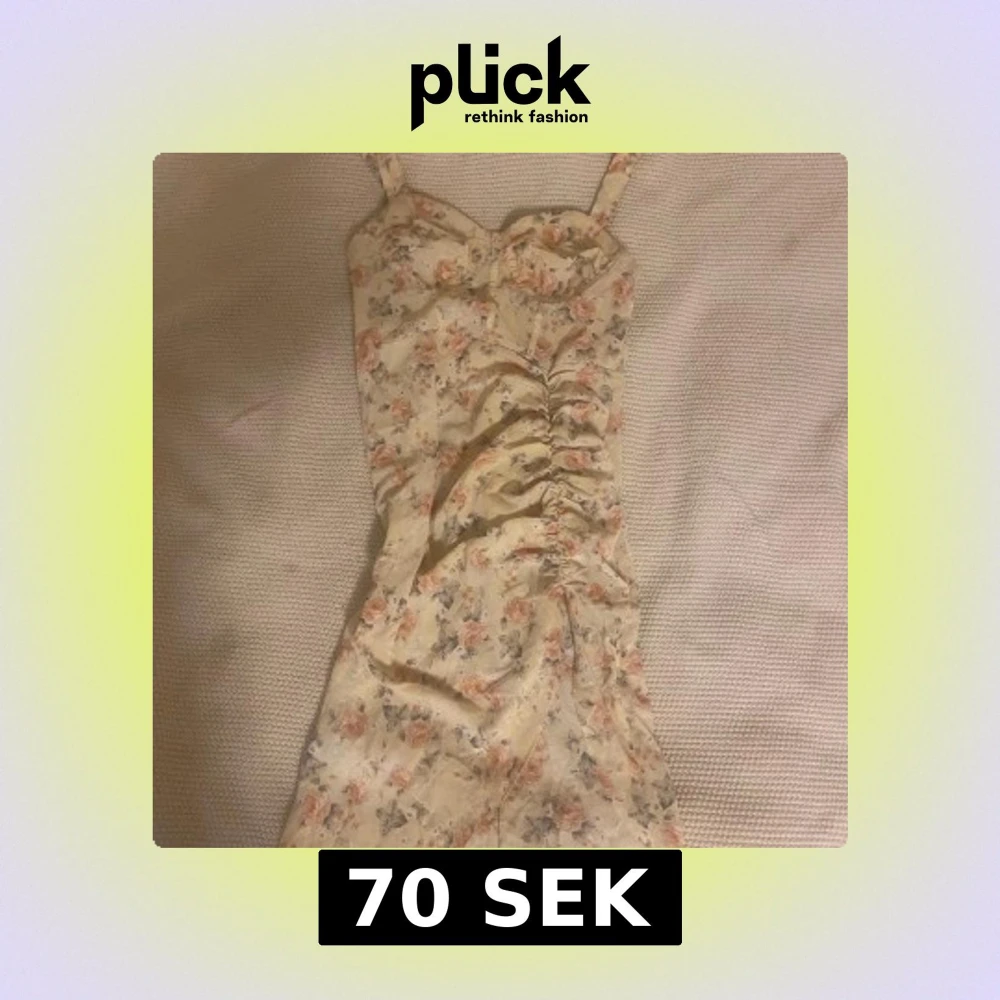 Supersöt kortklänning med smala axelband och rynk framtill. Ljus botten med blommigt mönster i rosa och grå toner. Sitter figurnära och har en feminin, romantisk vibe. Perfekt för sommarens alla tillfällen! Använd en gång.