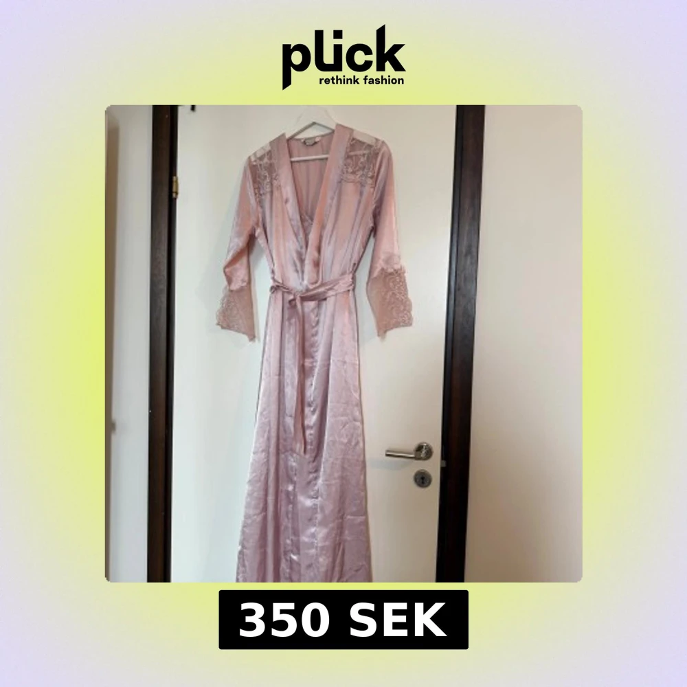 Superfin ljusrosa långklänning i satin med tunna axelband och v-ringning. Klänningen har vackra spetsdetaljer framtill och baktill samt en liten rosett vid bysten. Tillhörande matchande kimono med spets på ärmarna och knytband i midjan.