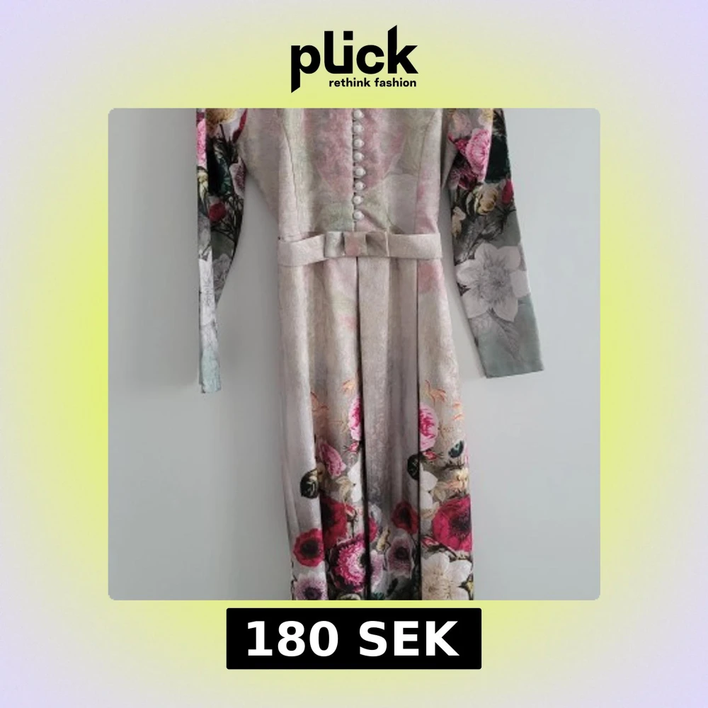 Elegant långklänning med blommigt mönster i rosa, rött och vitt. Klänningen har långa ärmar och knappar framtill samt ett matchande bälte i midjan. Perfekt för en stilfull look.