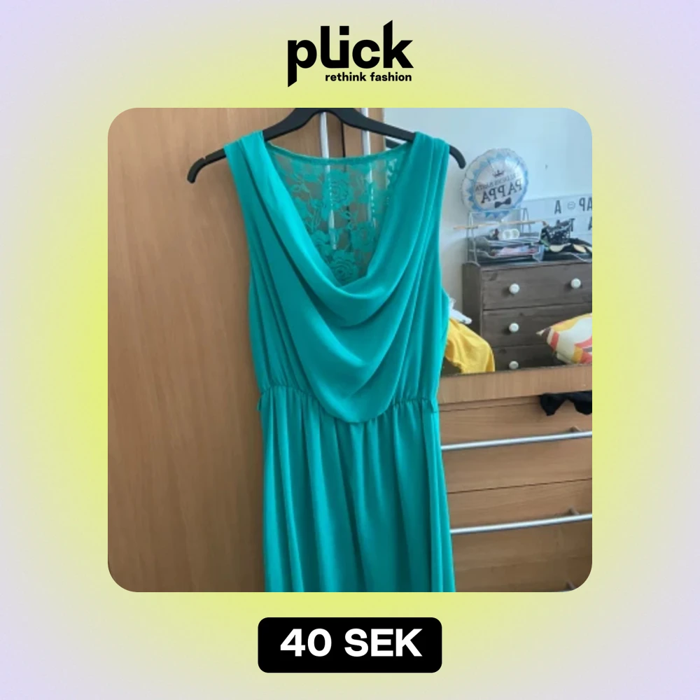 En fin turkos klänning, med en ganska stor urringning beroende på hur stor byst man har, sitter väldigt fint på. Spetts rygg. Vet ej riktigt storleken då jag ej hittat lappen, men skulle gissa på en M