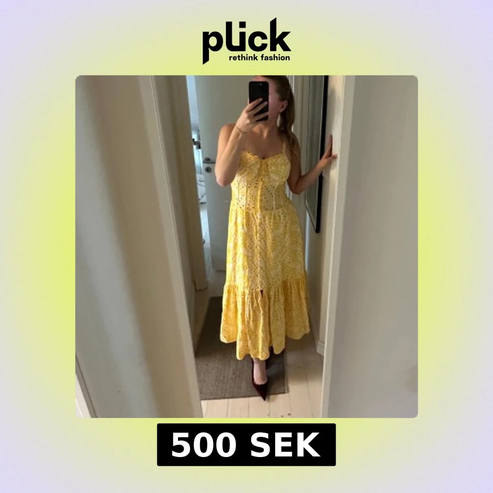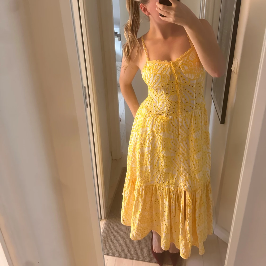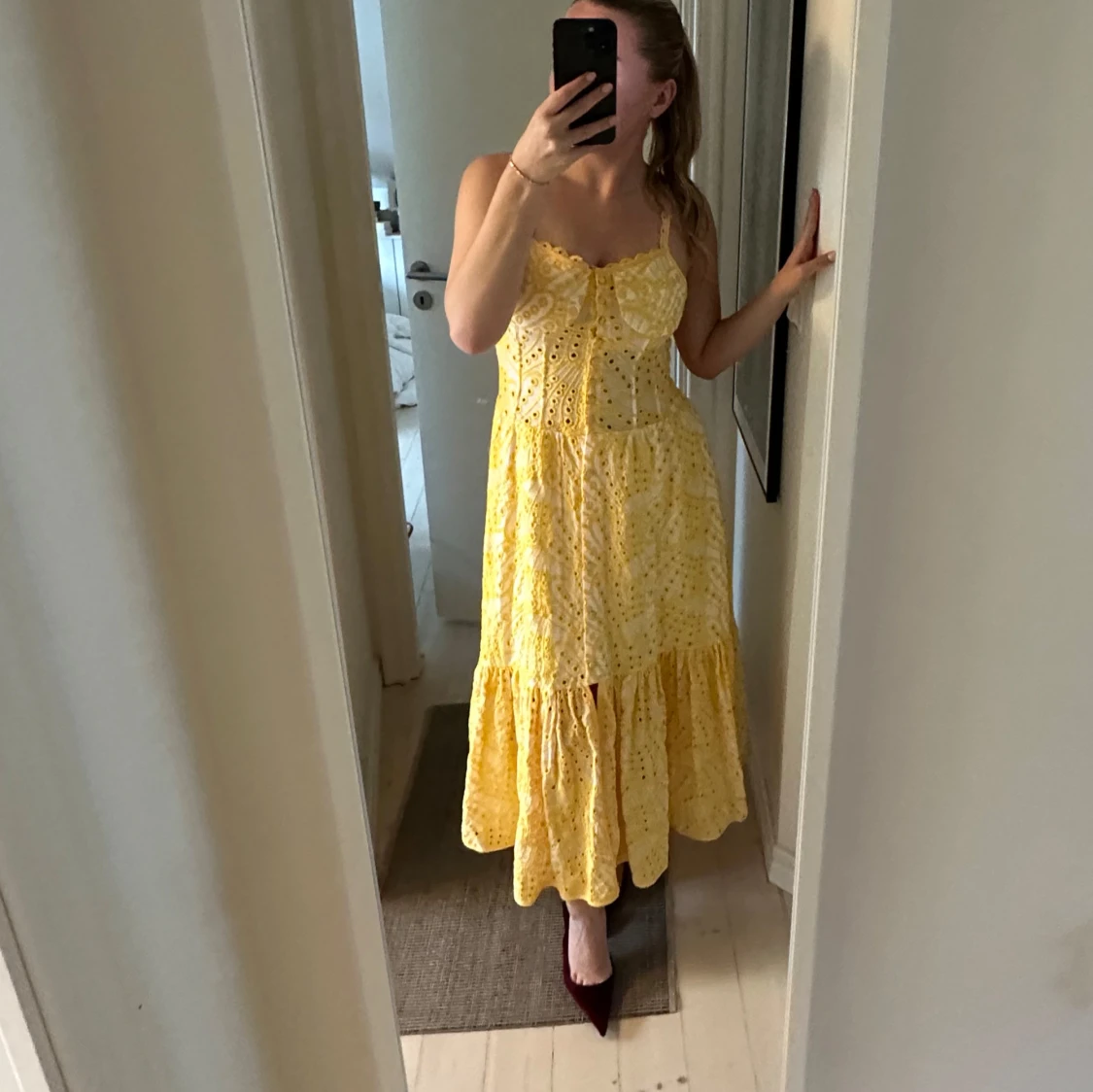 Superfin gul långklänning med broderade mönster och volang nertill. Klänningen har smala axelband, söt rosett framtill och en luftig passform. Perfekt för varma dagar och ger en riktigt somrig vibe.