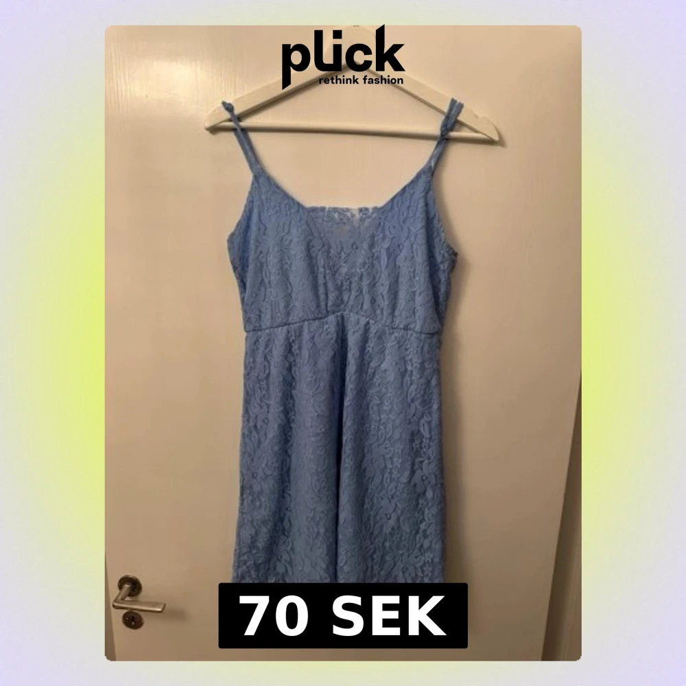 Superfin ljusblå klänning med smala axelband och v-ringning. Klänningen är täckt av ett vackert spetsmönster och har en kort längd som känns både söt och trendig. Perfekt för sommarens alla tillfällen!