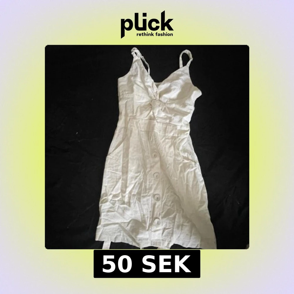 Supersöt vit kort klänning från Jasmine med smala axelband, knyt i midjan och knappar framtill. Klänningen har v-ringad omlott-topp och är gjord i ett lätt linneliknande material, perfekt för varma dagar.