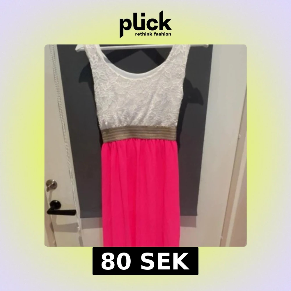 Snygg långklänning med vit spets upptill och rosa kjol. Midjan har ett brett guldigt band som ger extra stilpoäng. Klänningen har ärmlös design och rund halsringning, perfekt för dig som vill sticka ut med färg och detaljer.